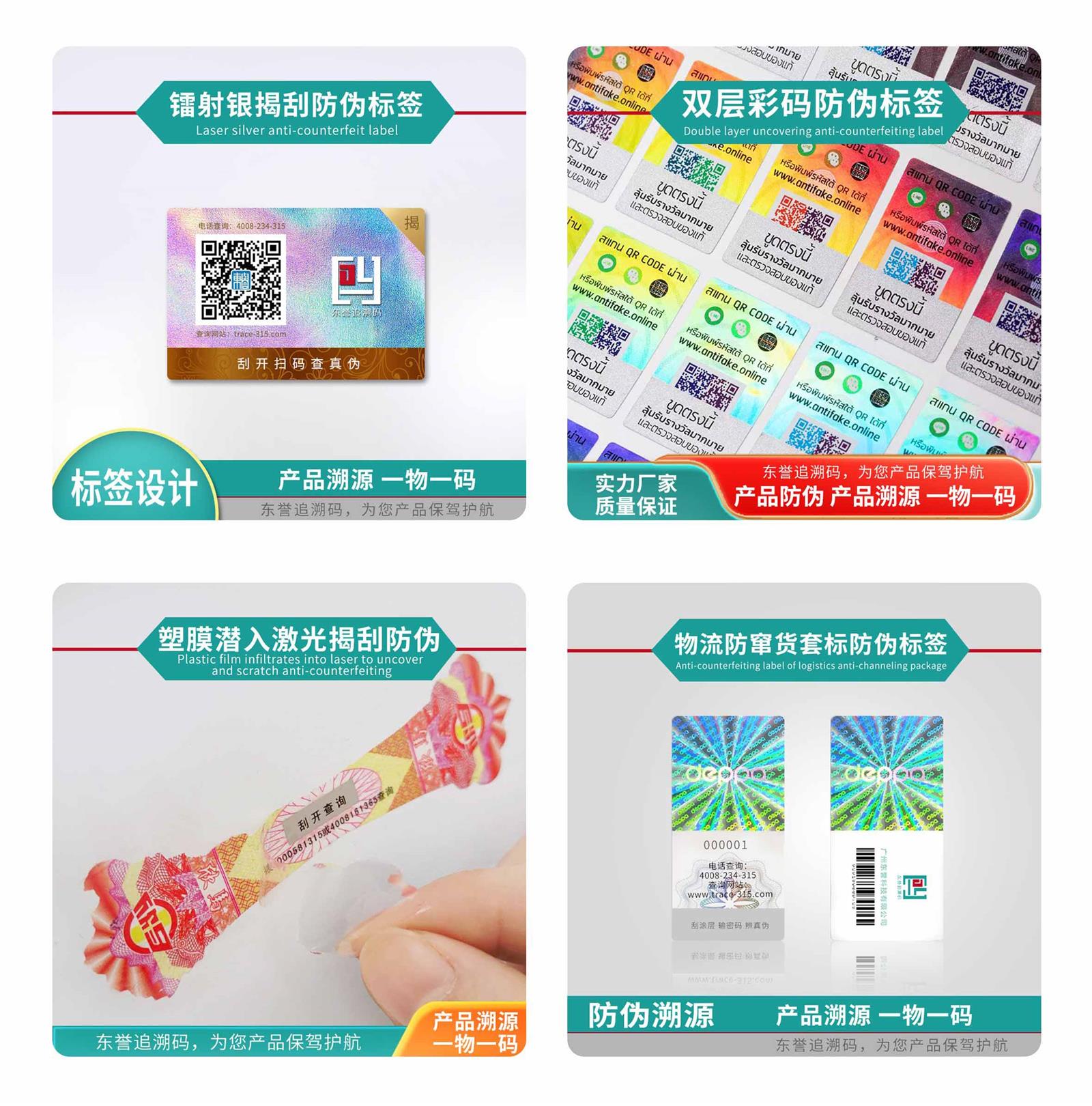防伪标签自身防伪特征以及识别方法是防伪标签得以生存的灵魂。防伪标签的品种很多,例如防伪字模标签、易碎标签等。一般根据不同产品防伪需求,选用不同防伪材料,通常有纸质不干胶、 PVC、PET等,激光标签采用的是氧化铝激光膜,纹理防伪采用的是 纤维纸,易碎标签采用的是易碎纸;部分高端产品采用安全线防伪 纸进行防伪处理。或是利用非常规印刷复制方式(如激光全息),都是防伪标签产品的制作方式。防伪标签应具有识别简单、安全可靠、不容易仿造等特点,才能为提高社会效益、规范市场提供坚 强后盾。防伪标签由专业的防伪公司或防伪印刷厂进行设计生产,不同类型防伪标签的生产工艺也各不相同。
