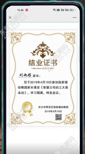 像上面的例子一样,用户使用智能手机,打开微信扫描纸质证书上的二维码即可查阅相关的电子证书,而且电子证书上的二维码与纸质证书上的二维码是一样的。当纸质证书出现损坏(只要二维码完整),用户都可以通过手机扫码展示自己的个人证书,这不失为一个证书的备份保存途径之一。同时电子证书还可以被下载到用户手机中,方便后期直接展示。 |